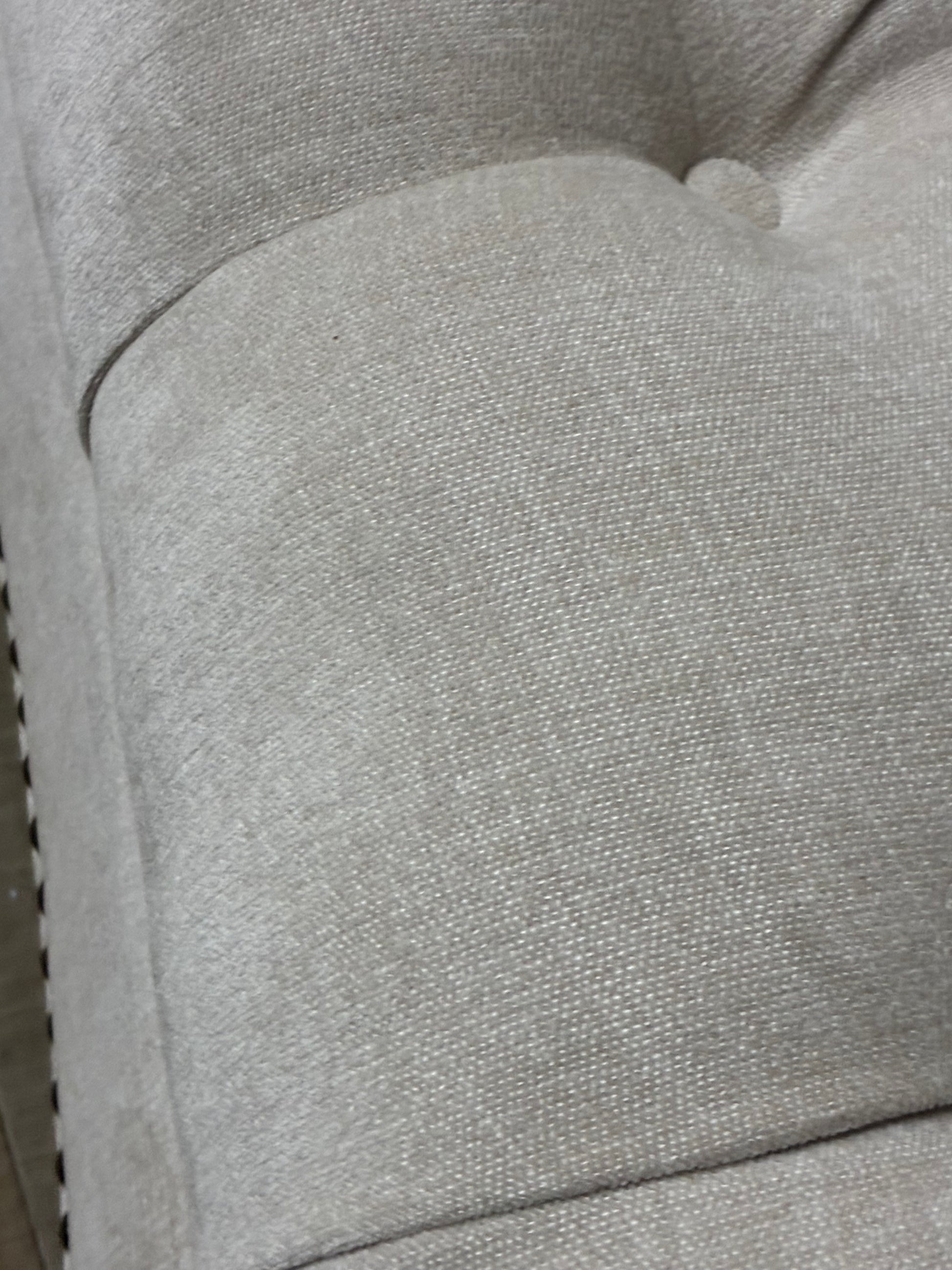 Classic tufted Curved back bench seat sofa. Curvaceous and shapely, with traditional elements like button-tufting and decorative nailhead trim, this bench seat sofa also conveys a modern sensibility covered in a subtly textured herringbone fabric, with metallic accents on the pillows. An antiqued metal ferrule caps the carved wood feet.