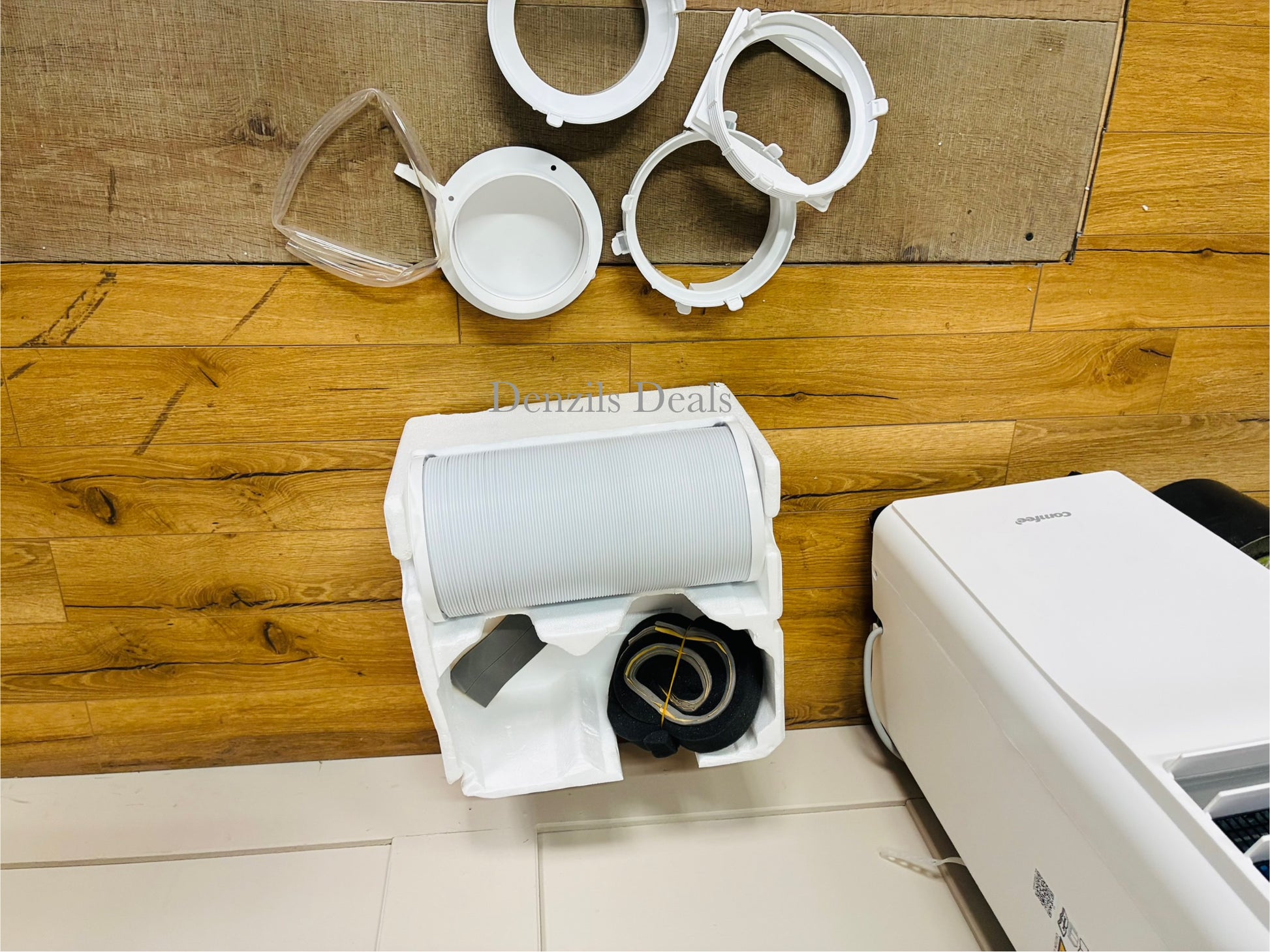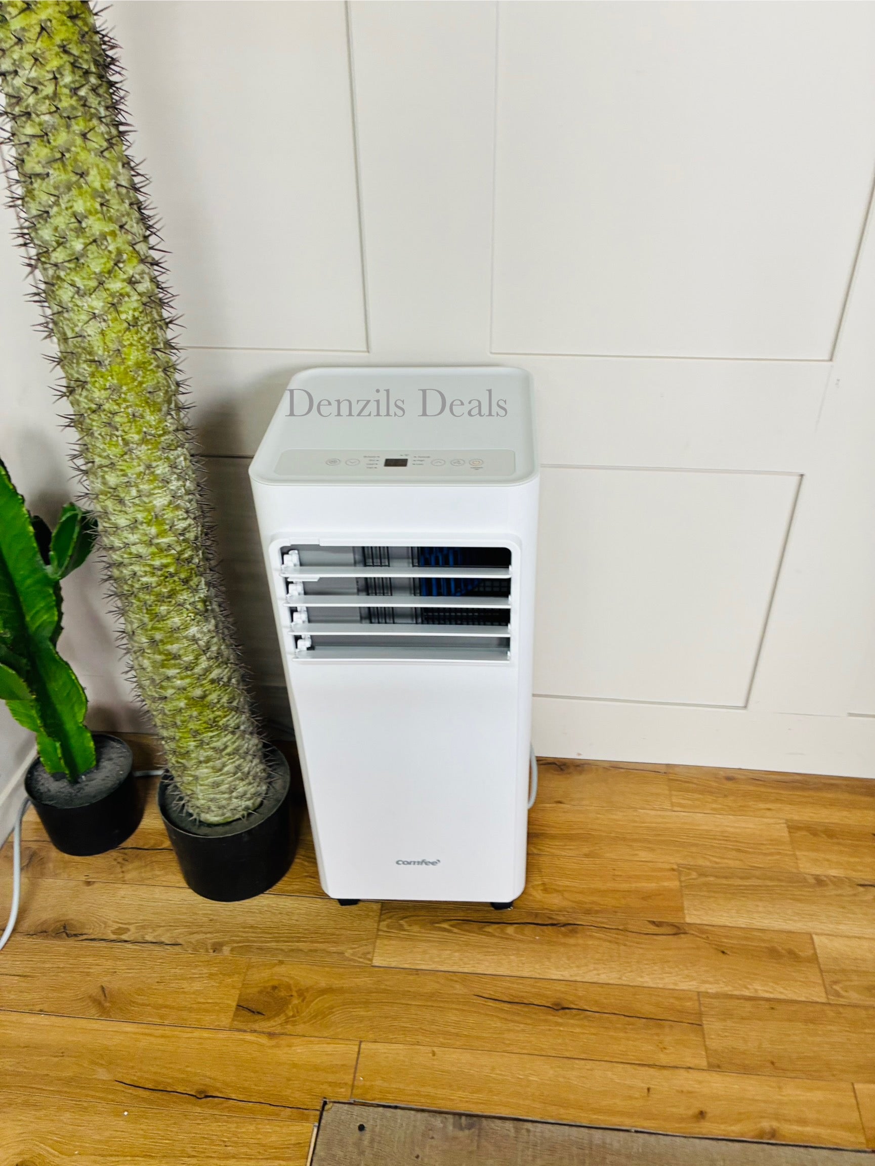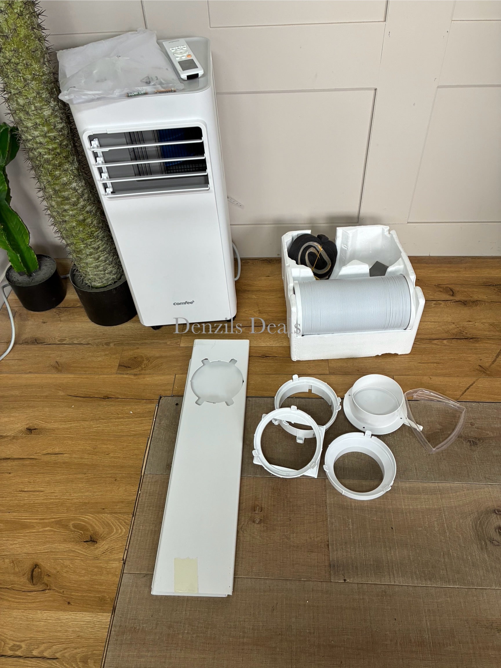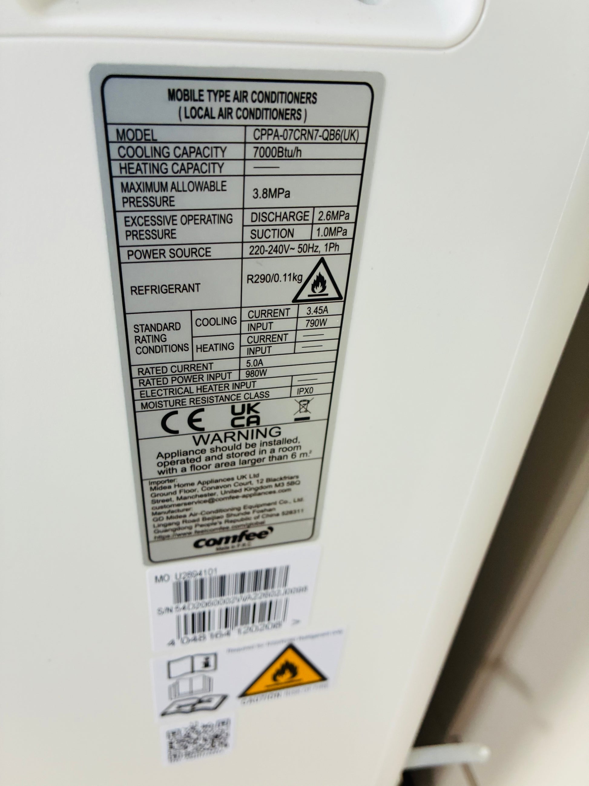Ex-display and n good condition as pictured. Has a very slight dent on side as pictured. Please see our pictures. Manufacturer’s information: POWERFUL COOLING] This 7000 BTU air conditioner delivers fast, effective cooling for spaces up to 269 sq. ft.(25㎡)while providing fan and dehumidification functions, creating a comfortable environment for the living room, office, basement, or workplace. [CONVENIENCE FOR USE] This smart air conditioner is WiFi-enabled and can connect to the App to control AC temperature with 24-hour timers. It is compatible with Amazon Alexa and Google Home for iPhone and Android. [ENERGY EFFICIENCY] ERP Energy Efficiency accredited and natural refrigerant R290, using this air conditioning unit with a Class A energy efficiency rating to reduce energy consumption and optimize energy usage. [EASY INSTALLATION] Roll your AC unit to the preferred area, and attach the exhaust hose and adjustable window brackets. Includes a window kit, no extra tools are needed for assembly. The installation instructions are simple enough for anyone to follow" for better readability and grammatical correctness. [WASHABLE AIR FILTER] To provide clean cool, air, a removable and reusable air filter is designed to protect you from dust and pet hair. We recommend cleaning the filter every week of operation to extend the life and performance of this AC unit. Manufacturer COMFEE' Part Number 4048164120208 Product Dimensions 29.3 x 29.5 x 70.5 cm; 21.6 kg Item model number CPPA-07CRN7-QB6(UK) Size 7000 BTU Colour White Style 7000 BTU-Smart Voltage 230 Volts Wattage 790 watts Installation method Window Item Package Quantity 1 Sound level 62.5 dB Special Features 4 Way Swing, Dehumidifier, Remote Controlled, WiFi Enabled Included Components Window Kit Batteries Required? No