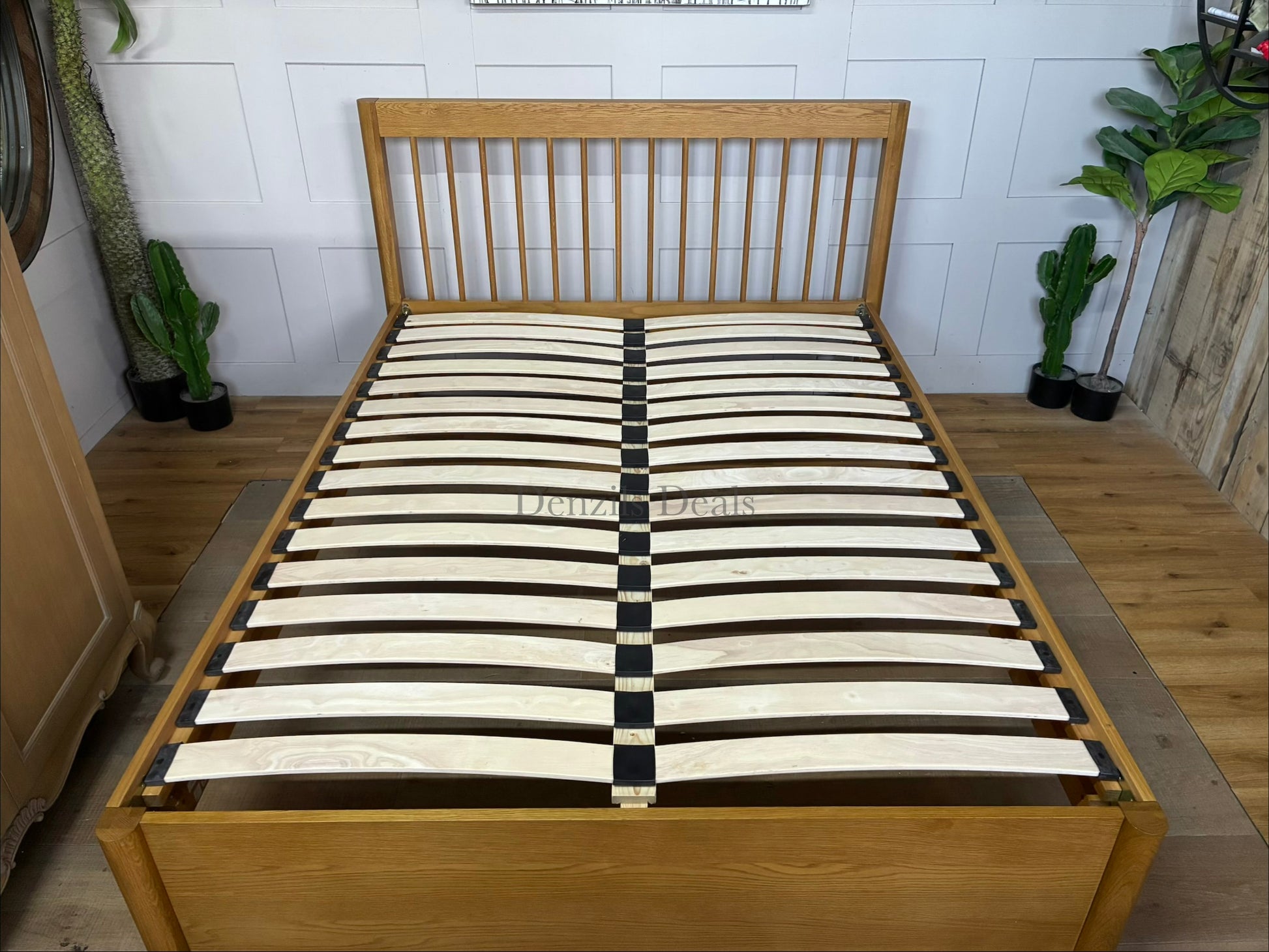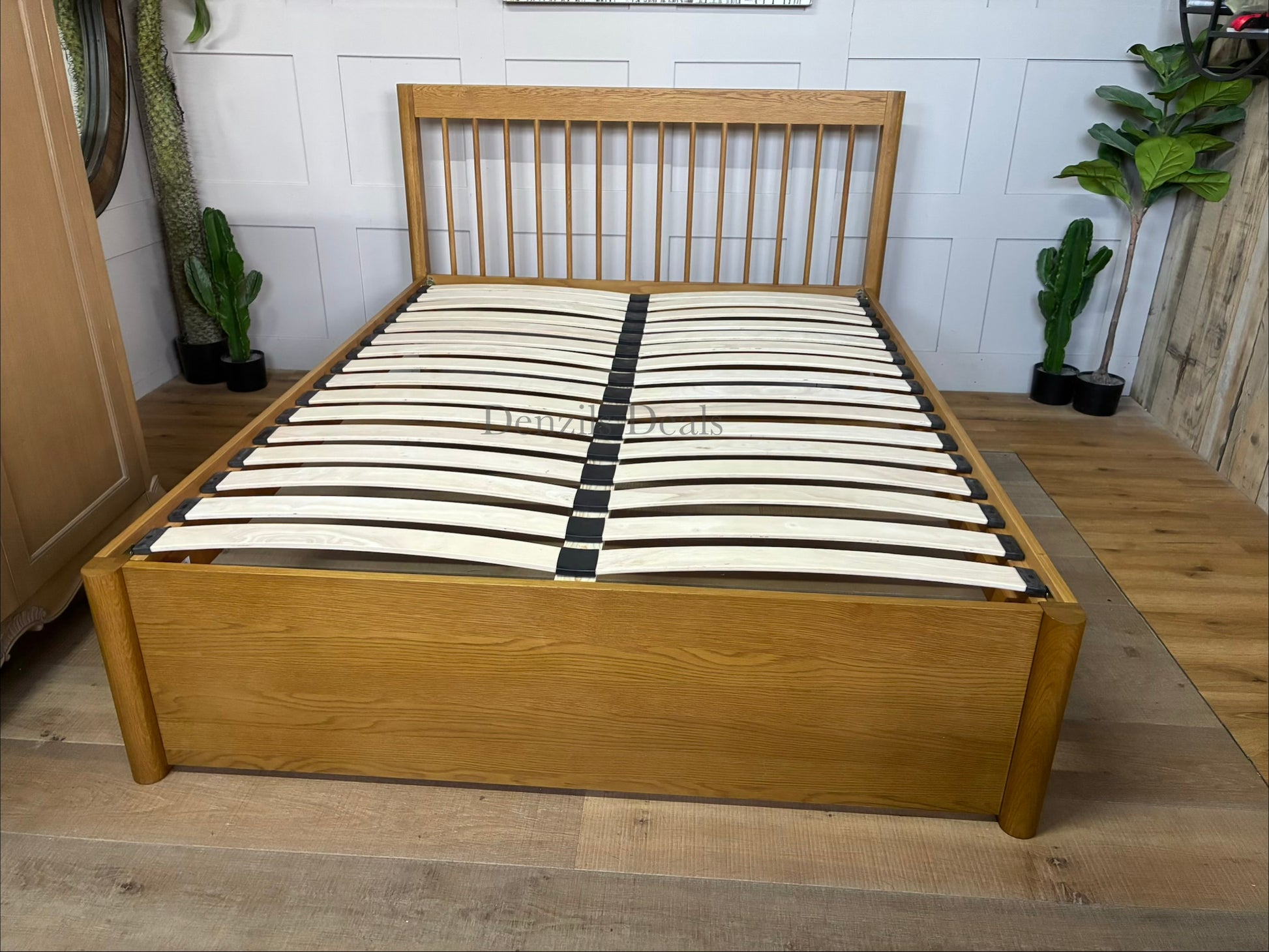 It's made from an impressive combination of solid oak, pine wood, MDF and plywood and it's coated in a durable lacquer, making it both tough and timeless option. We've also added supportive sprung slats to the base and we like how the rounded edges and spindle detail on the headboard offers a calmer finish.