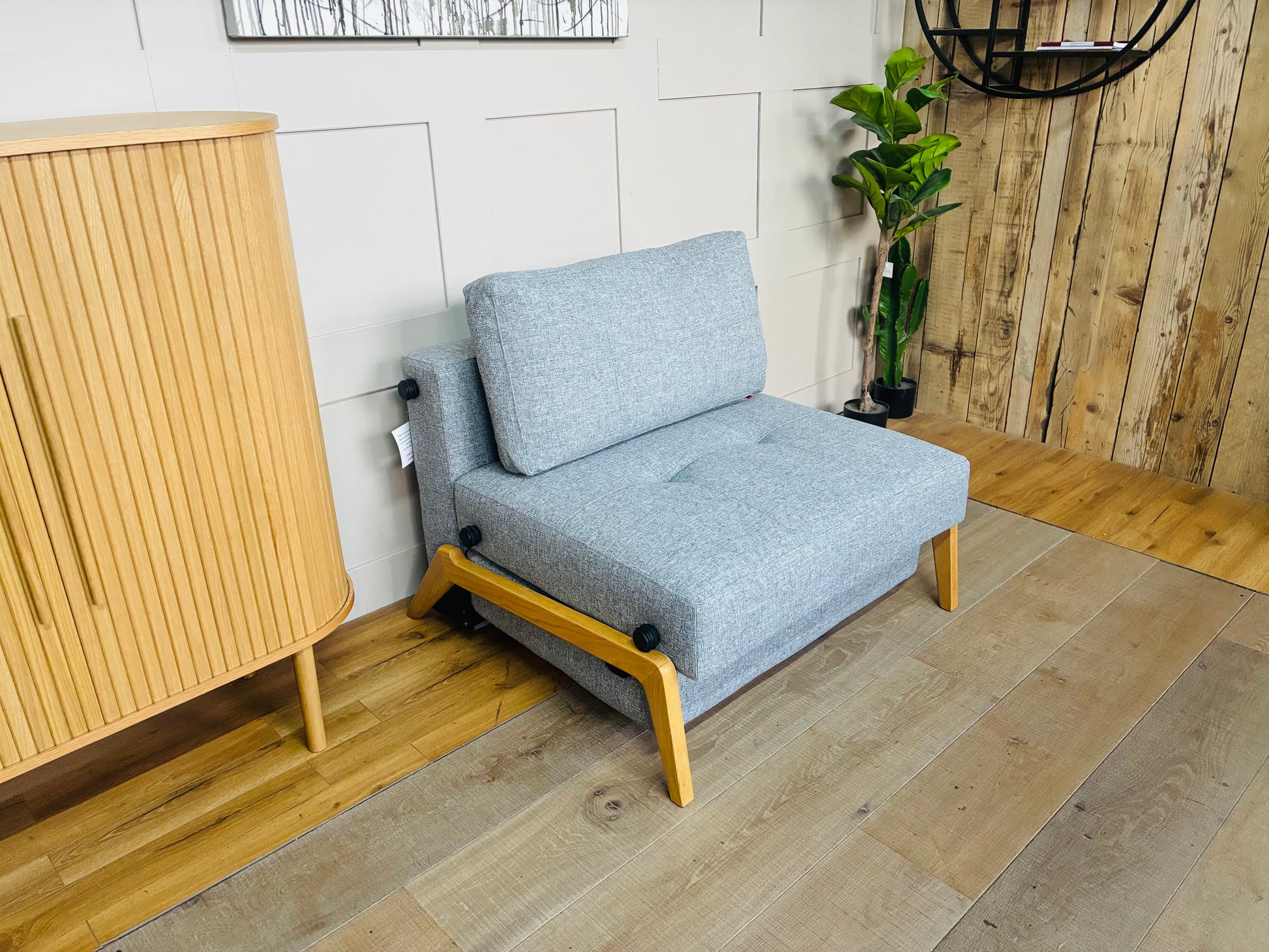 Ideal for compact living, Cubed 90 Wood folds out into any room, revealing a comfortable single-person bed. Functional chair bed in a natural Scandinavian design.