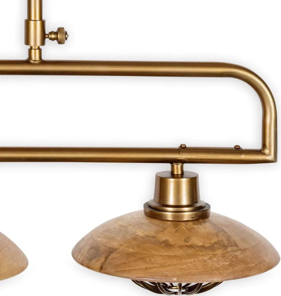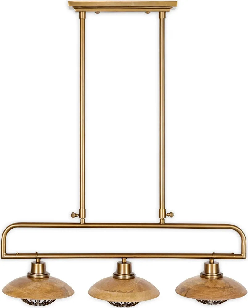 CONDITION: As new in good condition as pictured, but box open. Might have an odd pre handling mark. Please see our pictures. MANUFACTURER’s DESCRIPTION: Elevate your dining area with the Nkuku Chakai Mango Wood 3 Bar Pendant Light. Featuring a unique blend of natural mango wood and antique brass, this one-size bar adds a distinctive touch to your dining space, casting a warm, ambient light. Suspended on a solid frame, the height of the elegant Chakai dinner pendant is fully adjustable.